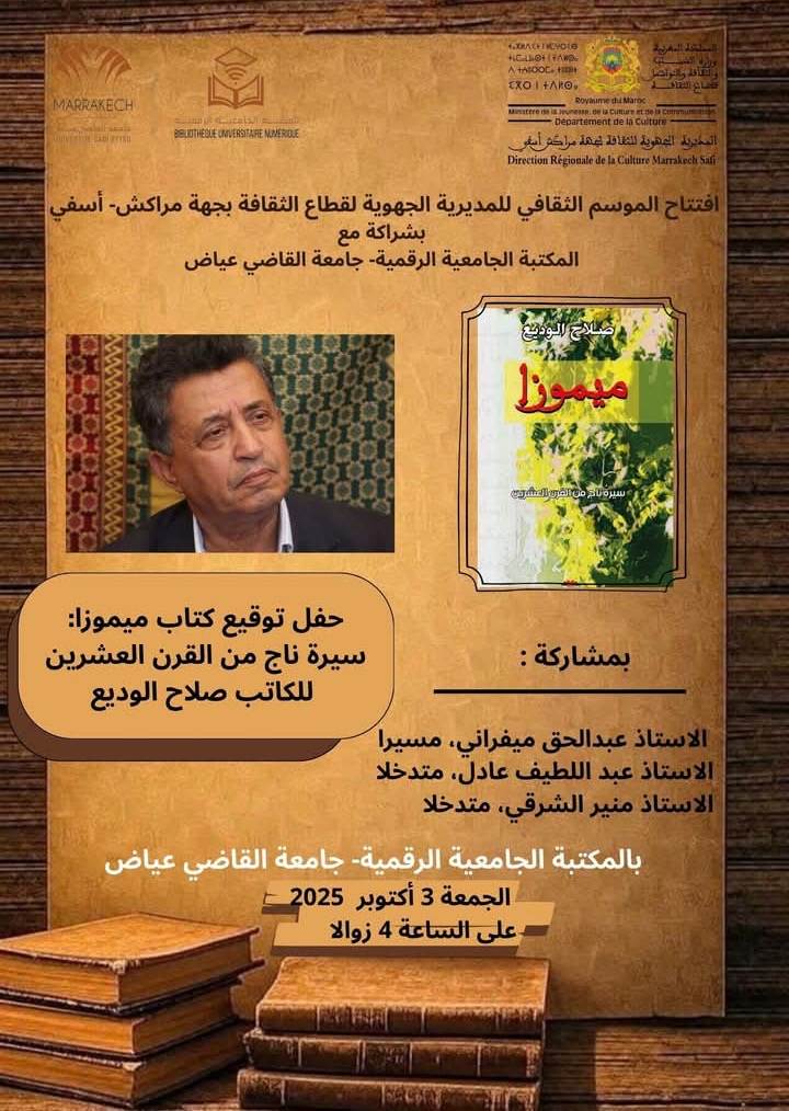 تستعد المديرية الجهوية لقطاع الثقافة بجهة مراكش-آسفي، بشراكة مع المكتبة الجامعية الرقمية التابعة لجامعة القاضي عياض، لإطلاق موسمها الثقافي الجديد 2025-2026 من خلال حفل توقيع كتاب “ميموزا: سيرة ناج من القرن العشرين” للكاتب والفاعل الثقافي صلاح الوديع، وذلك يوم الجمعة 3 أكتوبر 2025، على الساعة الرابعة بعد الزوال، بقاعة الندوات بالمكتبة الجامعية الرقمية.