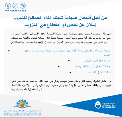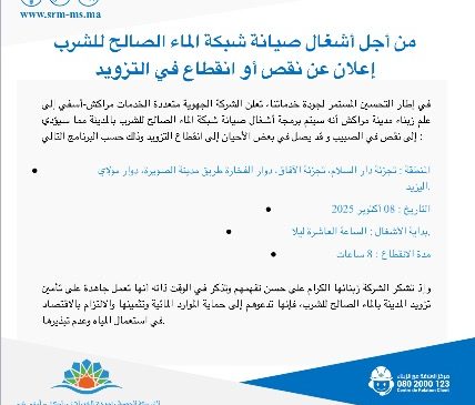 في إطار التحسين المستمر لجودة خدماتنا، تعلن الشركة الجهوية متعددة الخدمات مراكش أسفي لي علم زبناء مدينة مراكش أنه سيتم برمجة أشغال صيانة شبكة الماء الصالح للشرب بالمدينة مما يؤدي إلى نقص في الصبيب وقد يصل في بعض الأحيان إلى انقطاع التزويد وذلك حسب البرنامج التالي