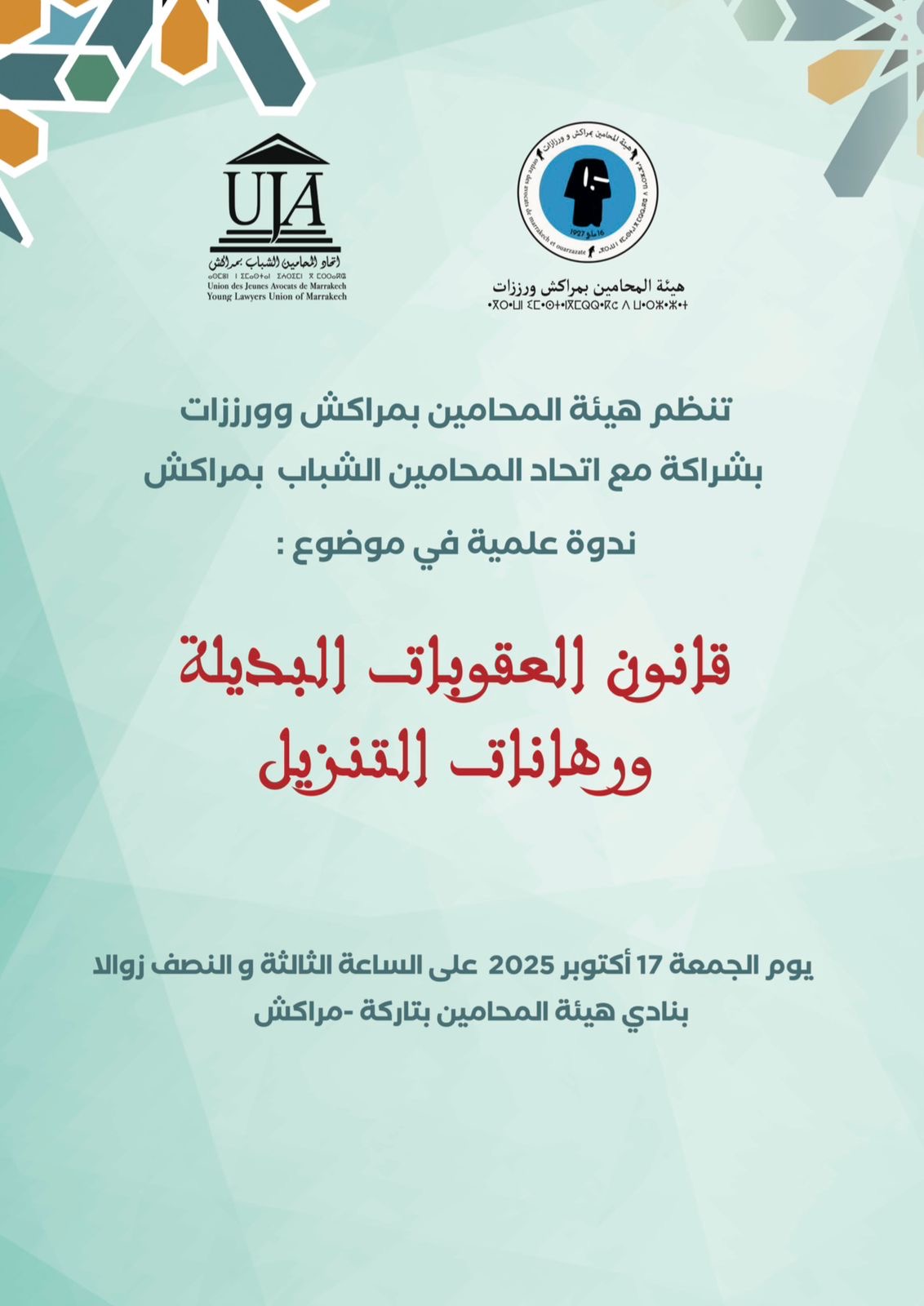 تنظم هيئة المحامين بمراكش وورزازات، بشراكة مع اتحاد المحامين الشباب بمراكش، ندوة علمية هامة حول موضوع: “قانون العقوبات البديلة ورهانات التنزيل”، وذلك يوم الجمعة 17 أكتوبر 2025 على الساعة الثالثة والنصف زوالاً، بفضاء نادي هيئة المحامين بتاركة – مراكش.
