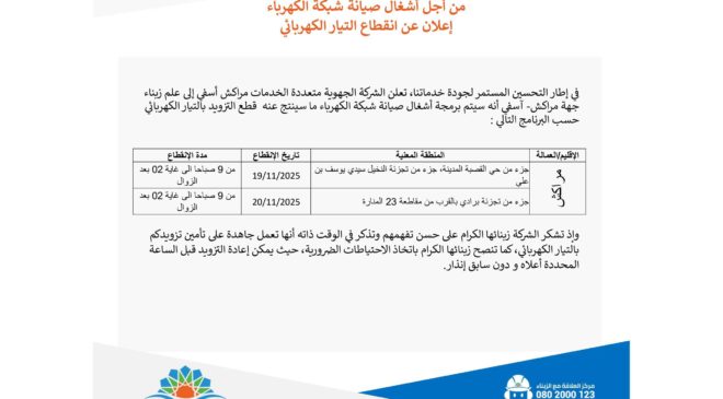وإذ تشكر الشركة زبنائها الكرام على حسن تفهمهم وتذكر في الوقت ذاته أنها تعمل جاهدة على تأمين تزويدكم بالتيار الكهربائي، كما تنصح زبنائها الكرام باتخاذ الاحتياطات الضرورية، حيث يمكن إعادة التزويد قبل الساعة المحددة أعلاه و دون سابق إنذار.