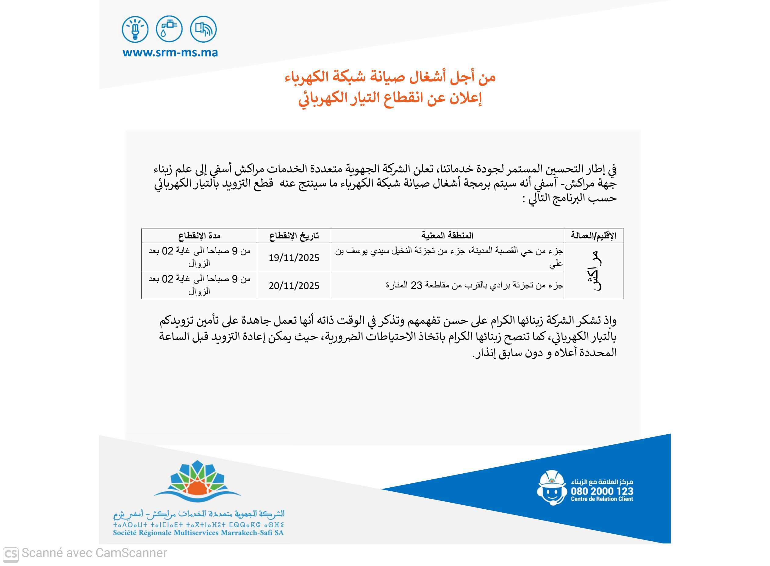 في إطار التحسين المستمر لجودة خدمات الشركة الجهوية متعددة الخدمات مراكش أسفي، تعلن إلى علم زبناء مراكش أنه سيتم برمجة أشغال صيانة شبكة الكهرباء ما سينتج عنه قطع التزويد بالتيار الكهربائي حسب البرنامج التالي :