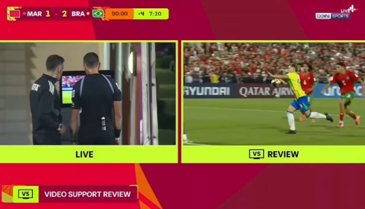 وفي وقت كانت المباراة تلفظ أنفاسها الأخيرة، خطف اللاعب ديل الهدف الثاني للبرازيل، وسط احتجاج مغربي كبير بعدما لم يُلغ الهدف رغم لمس المهاجم الكرة باليد قبل مراوغته الحارس بلعروش، ورغم استخدام البطاقة الخاصة بالتحدي (Challenge Card). ليُحسم اللقاء بانتصار البرازيل 2-1 وتأهلها إلى نصف النهائي لمواجهة البرتغال.