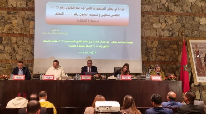 الجلسة الافتتاحية عرفت مداخلة خالد كركودوي الوكيل العام للملك، الذي قدم قراءة في أهم التعديلات التي حملها القانون 03.23 على مستوى البحث التمهيدي والمساطر القضائية.