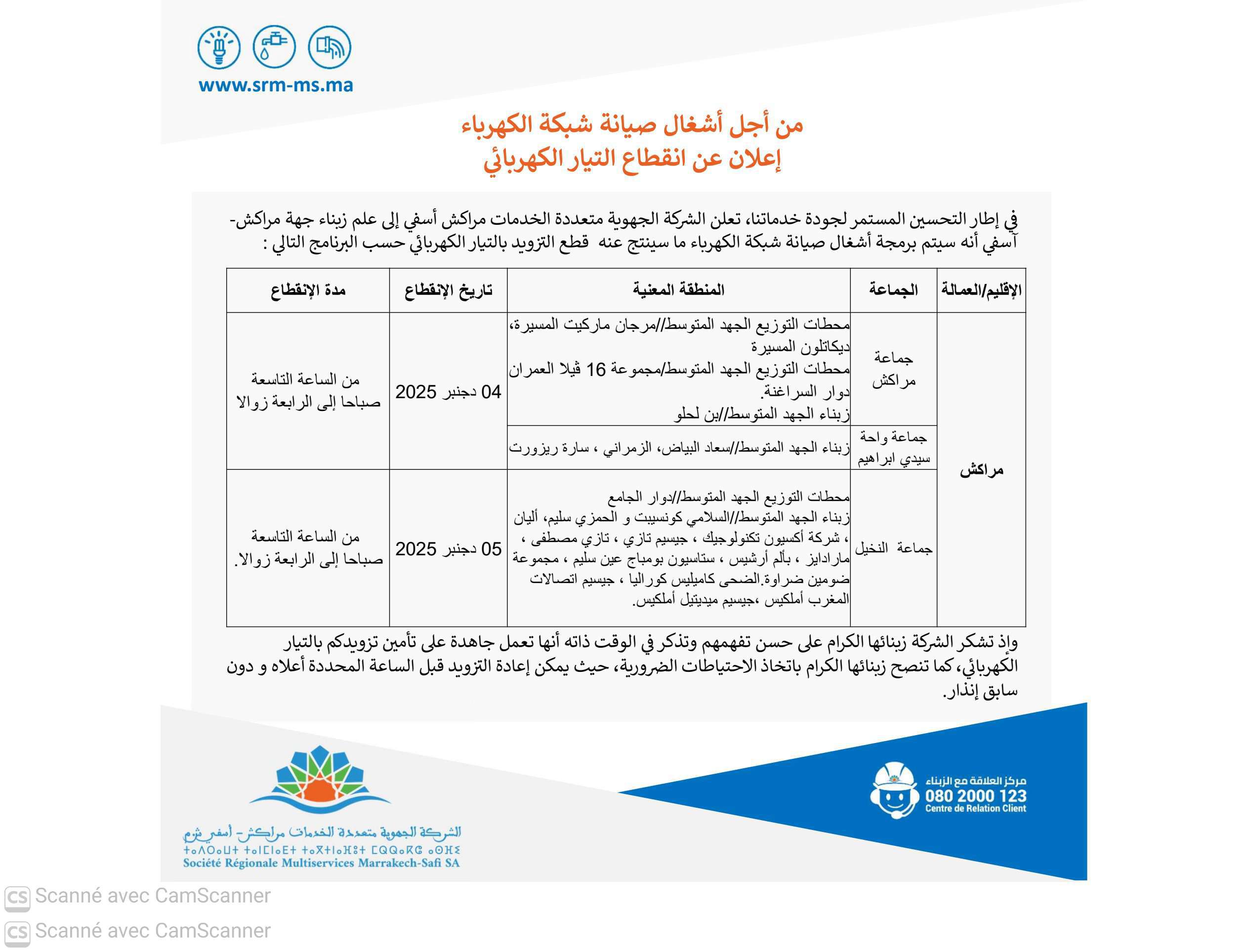 في إطار التحسين المستمر لجودة خدمات الشركة الجهوية متعددة الخدمات مراكش أسفي، تعلن إلى علم زبناء جهة مراكش آسفي أنه سيتم برمجة أشغال صيانة شبكة الكهرباء ما سينتج عنه قطع التزويد بالتيار الكهربائي حسب البرنامج التالي :