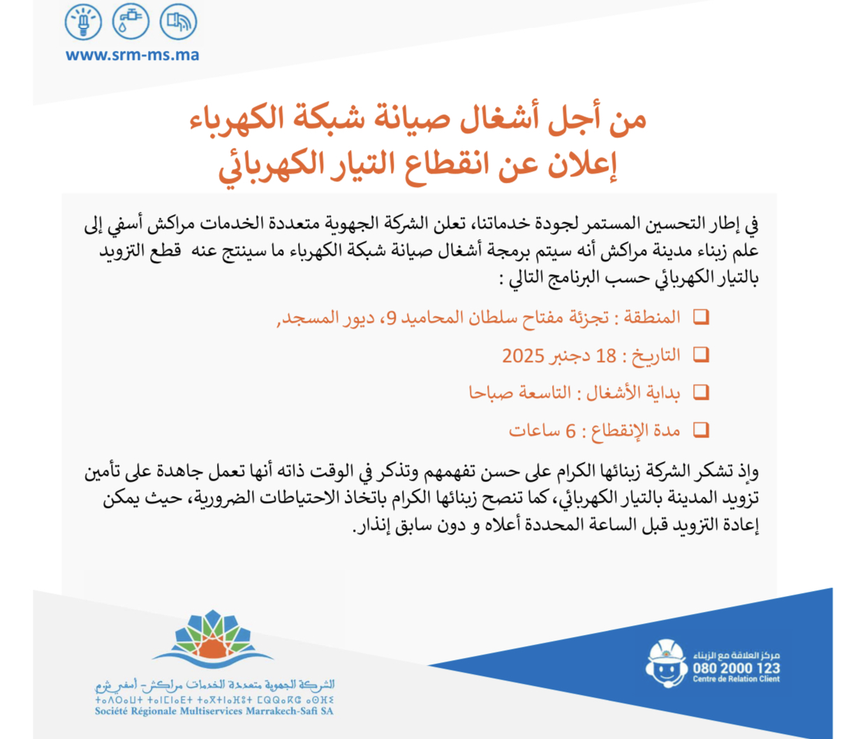 في إطار التحسين المستمر لجودة خدماتنا، تعلن الشركة الجهوية متعددة الخدمات مراكش أسفى إلى علم زبناء مدينة مراكش أنه سيتم برمجة أشغال صيانة شبكة الكهرباء ما سينتج عنه قطع التزويد بالتيار الكهربائي حسب البرنامج التالي :