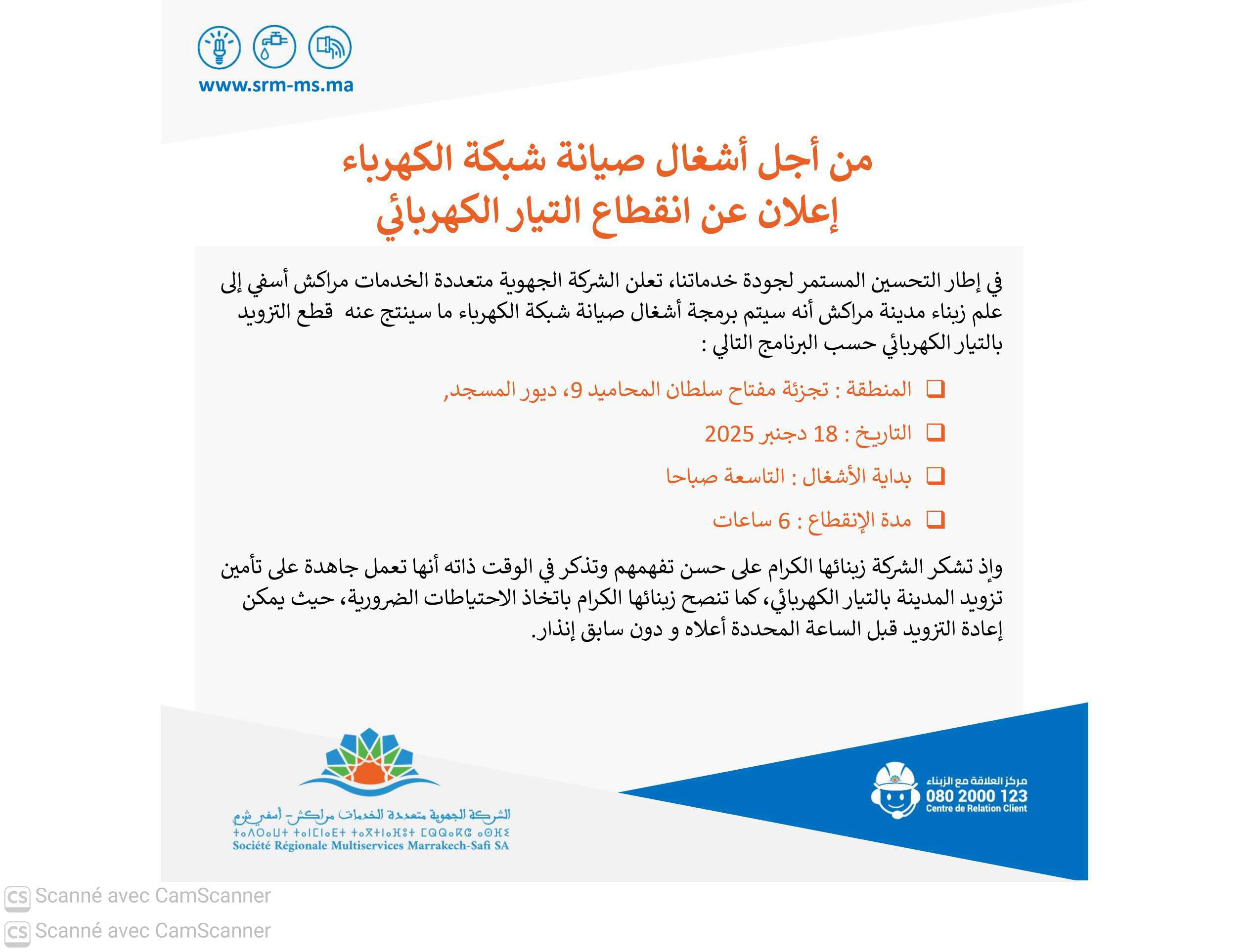 في إطار التحسين المستمر لجودة خدمات الشركة الجهوية متعددة الخدمات مراكش أسفي، تعلن إلى علم زبناء مراكش أنه سيتم برمجة أشغال صيانة شبكة الكهرباء ما سينتج عنه قطع التزويد بالتيار الكهربائي حسب البرنامج التالي :