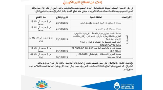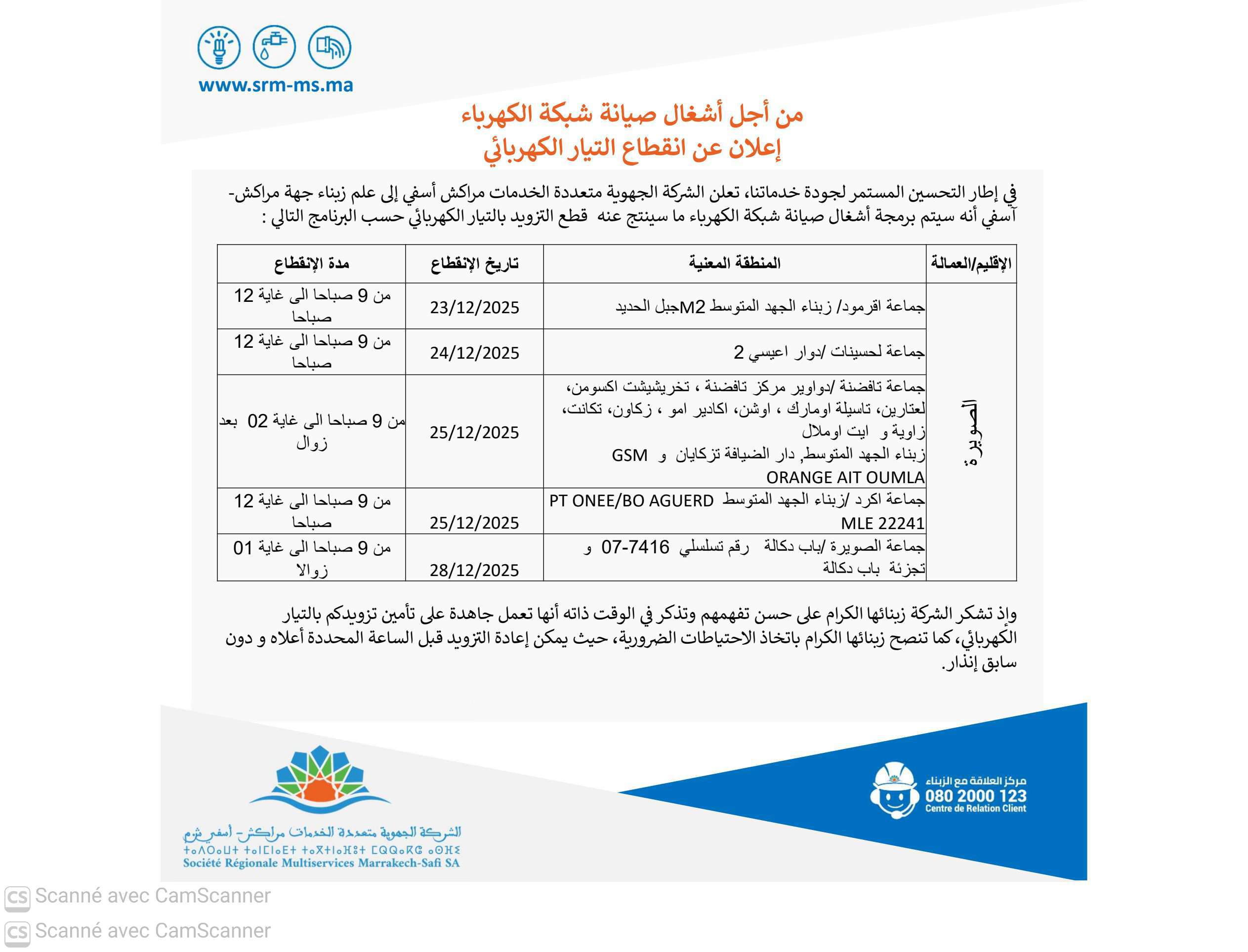 في إطار التحسين المستمر لجودة خدمات الشركة الجهوية متعددة الخدمات مراكش أسفي، تعلن إلى علم زبناء إقليم الصويرة أنه سيتم برمجة أشغال صيانة شبكة الكهرباء ما سينتج عنه قطع التزويد بالتيار الكهربائي حسب البرنامج التالي :