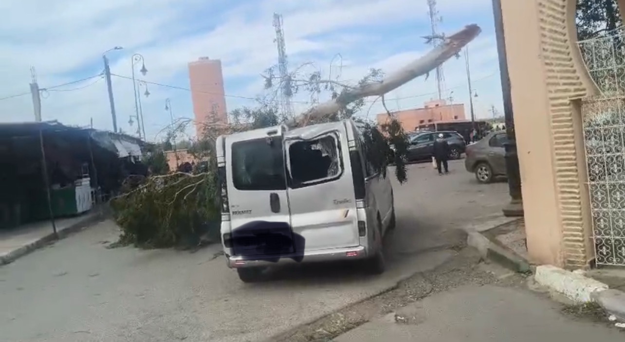 تسببت الرياح القوية التي شهدتها جماعة تمصلوحت، ضواحي مدينة مراكش، في سقوط شجرة من نوع الكاليبتوس على سيارة خفيفة بأحد المحاور الطرقية، ما أسفر عن خسائر مادية دون تسجيل أية إصابات في الأرواح.
