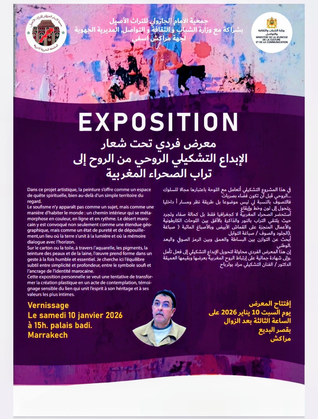 يحتضن قصر البديع التاريخي بمدينة مراكش معرضًا فنيًا جديدًا للفنان التشكيلي المراكشي مراد بولرباح، تحت شعار: «الإبداع التشكيلي الروحي: من الروح إلى تراب الصحراء المغربية»، وذلك ابتداءً من يوم السبت 10 يناير الجاري إلى غاية 29 منه، في تظاهرة فنية مفتوحة في وجه العموم.