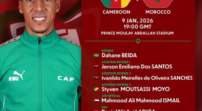 كشف الاتحاد الأفريقي لكرة القدم “كاف” عن الطاقم التحكيمي الذي سيُدير المواجهة المرتقبة بين المنتخبين المغربي والكاميروني، المقررة مساء غد الجمعة، ضمن منافسات ربع نهائي كأس أمم أفريقيا 2025.