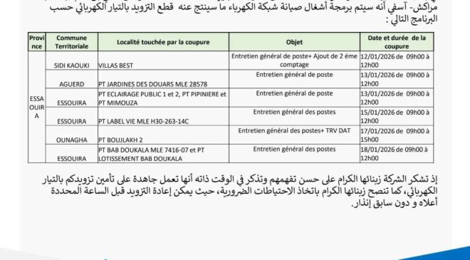 إعلان عن إنقطاع التيار الكهربائي عن هذه المناطق بإقليم الصويرة