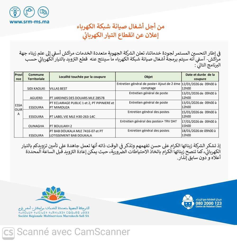 في إطار التحسين المستمر لجودة خدمات الشركة الجهوية متعددة الخدمات مراكش أسفي، تعلن إلى علم زبناء مراكش أنه سيتم برمجة أشغال صيانة شبكة الكهرباء ما سينتج عنه قطع التزويد بالتيار الكهربائي حسب البرنامج التالي :