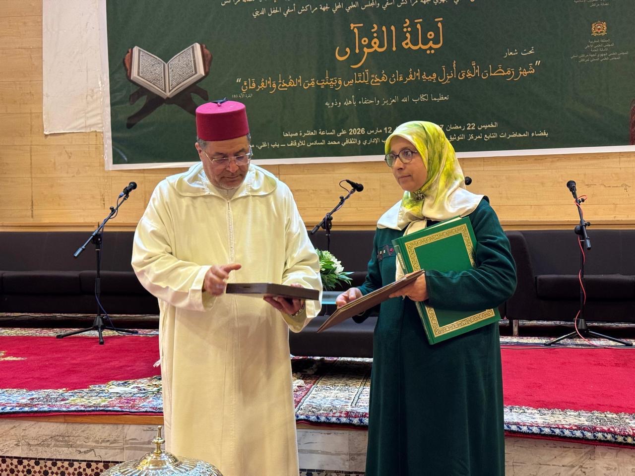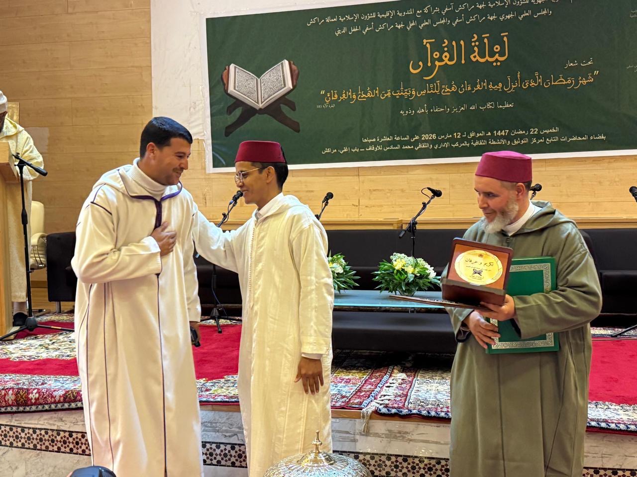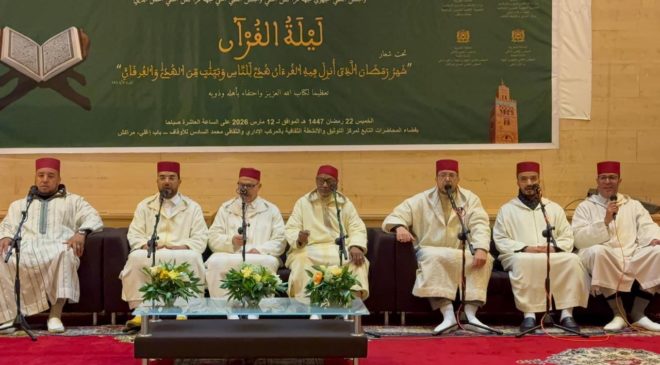 احتضنت مدينة مراكش، صباح (الخميس ) 12 مارس الجاري ، حفلاً دينياً متميزاً تحت عنوان “ليلة القرآن”، نظمته المندوبية الجهوية للشؤون الإسلامية لجهة مراكش آسفي بشراكة مع المندوبية الإقليمية للشؤون الإسلامية بعمالة مراكش والمجلس العلمي الجهوي لجهة مراكش آسفي والمجلس العلمي المحلي بمراكش، وذلك بفضاء المحاضرات التابع لمركز التوثيق والأنشطة الثقافية بالمركب الإداري والثقافي محمد السادس للأوقاف بباب أغمات.