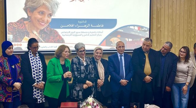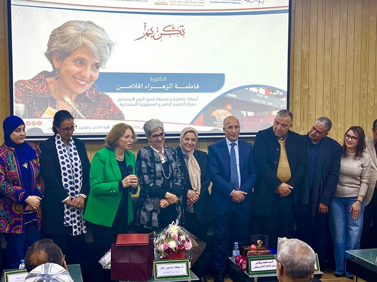 كما شهدت هذه الندوة لحظة تكريم مؤثرة للأستاذة فاطمة الزهراء إفلاحن، منسقة محور النوع الاجتماعي وإحدى مؤسسات مركز التعليم الدامج والمسؤولية الاجتماعية ، تقديرا لمسارها العلمي والنضالي في الدفاع عن قضايا المساواة داخل الجامعة وخارجها. وقد شكلت هذه المبادرة لحظة امتزجت فيها مشاعر الاعتزاز والتقدير في صفوف الحاضرين، اعترافا بإسهاماتها في ترسيخ قيم الإنصاف وحمل صوت المرأة.