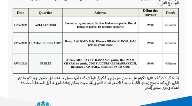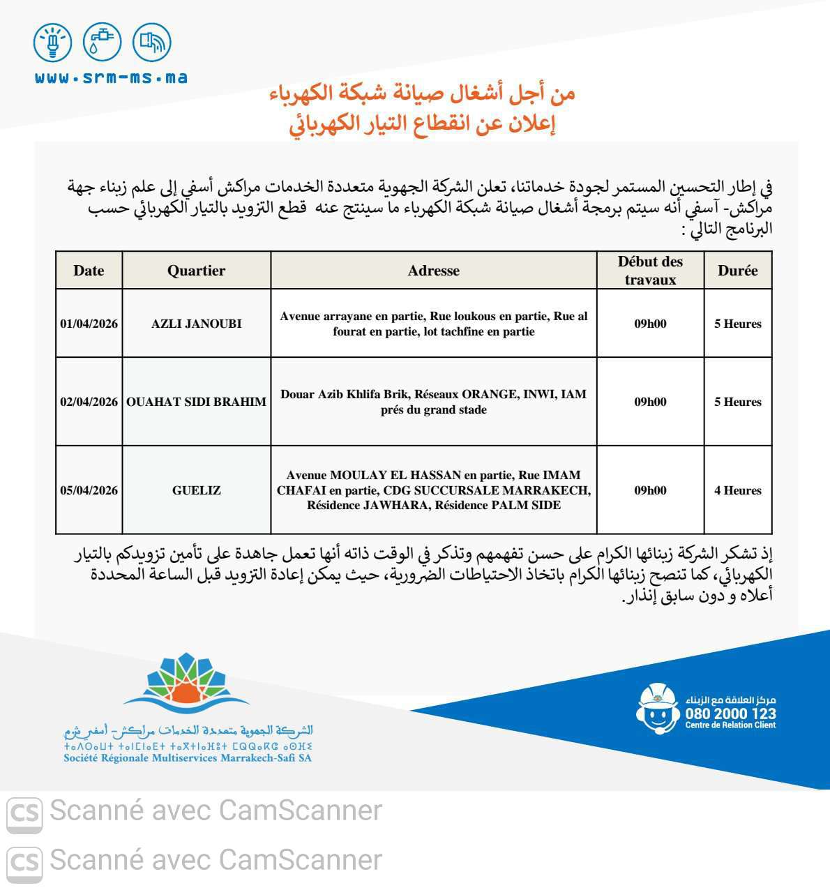 في إطار التحسين المستمر لجودة خدمات الشركة الجهوية متعددة الخدمات مراكش أسفي، تعلن إلى علم زبناء مراكش أنه سيتم برمجة أشغال صيانة شبكة الكهرباء ما سينتج عنه قطع التزويد بالتيار الكهربائي حسب البرنامج التالي :