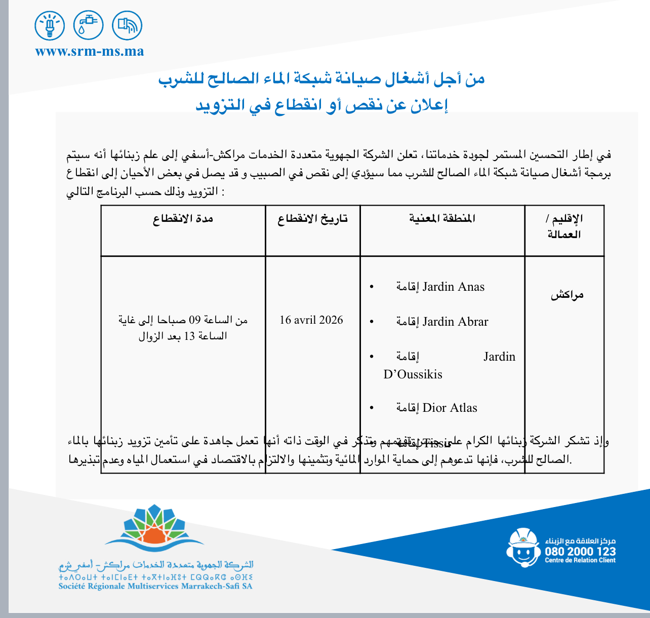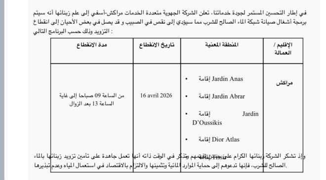 وأوضحت الشركة، في بلاغ لها، أن هذه الاضطرابات ستهم يوم 16 أبريل 2026، مجموعة من الإقامات السكنية، من بينها: Jardin Anas، وJardin Abrar، وJardin D’Oussikis، وDior Atlas، وذلك خلال الفترة الممتدة من الساعة التاسعة صباحًا إلى غاية الساعة الواحدة بعد الزوال.